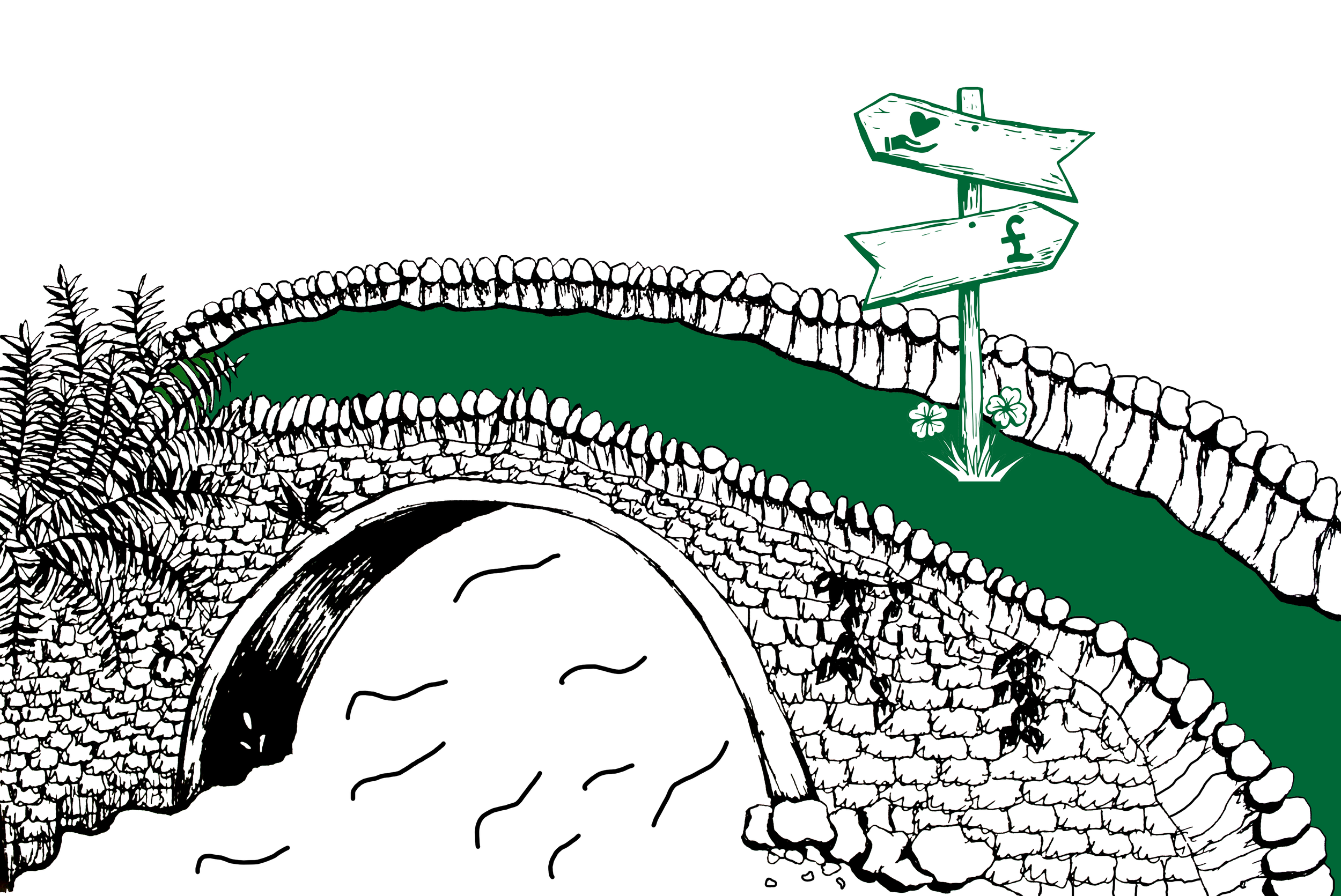NEWCASTLE: The DETERMIND signpost sitting on a bridge in Jesmond Dene park. The bridge is made of stone, with ferns and vines creeping out. The bridge sits above flowing water from the nearby waterfall.