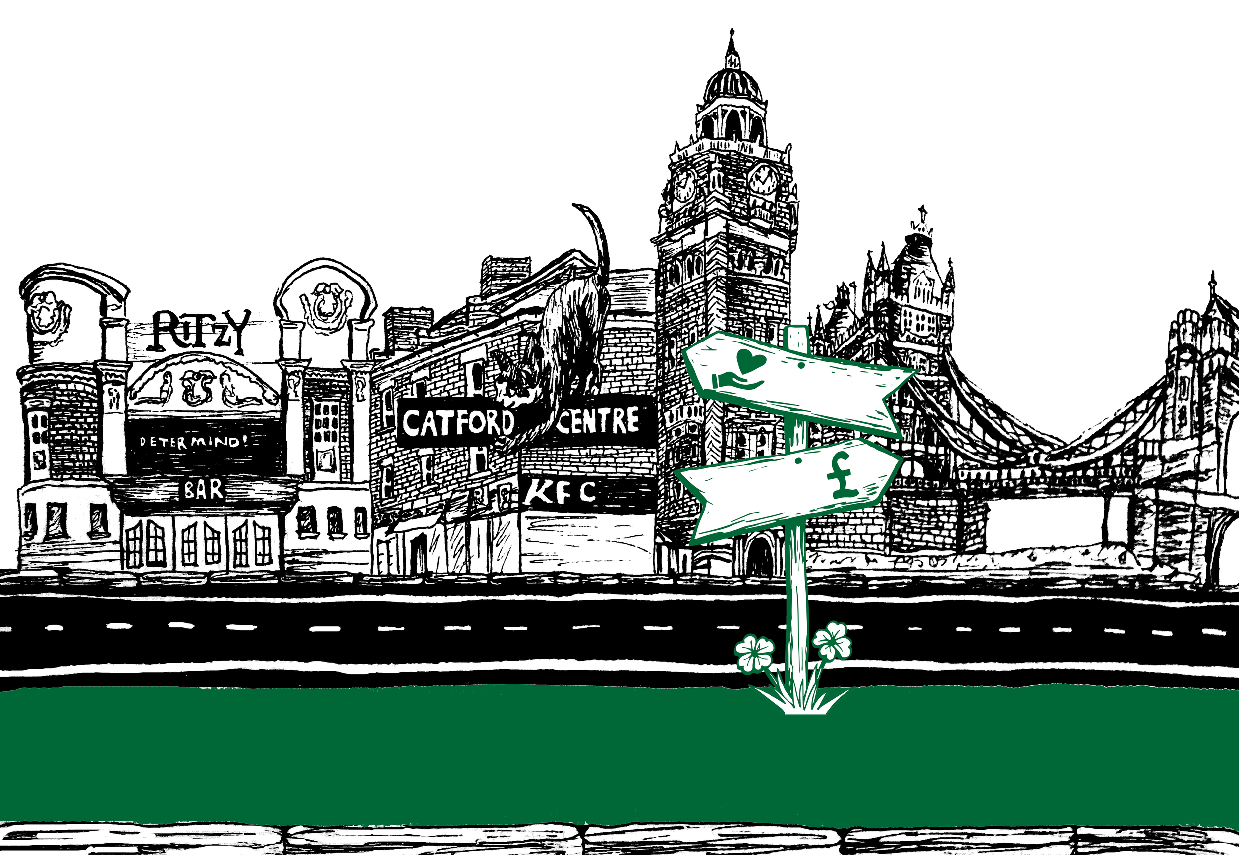 LONDON: The DETERMIND signpost on a fictional road with buildings from our four main London boroughs. From left to right: Brixton Ritzy, the Catford Centre, Croydon Clocktower and Tower Bridge (the south exit of which sits in Southwark).