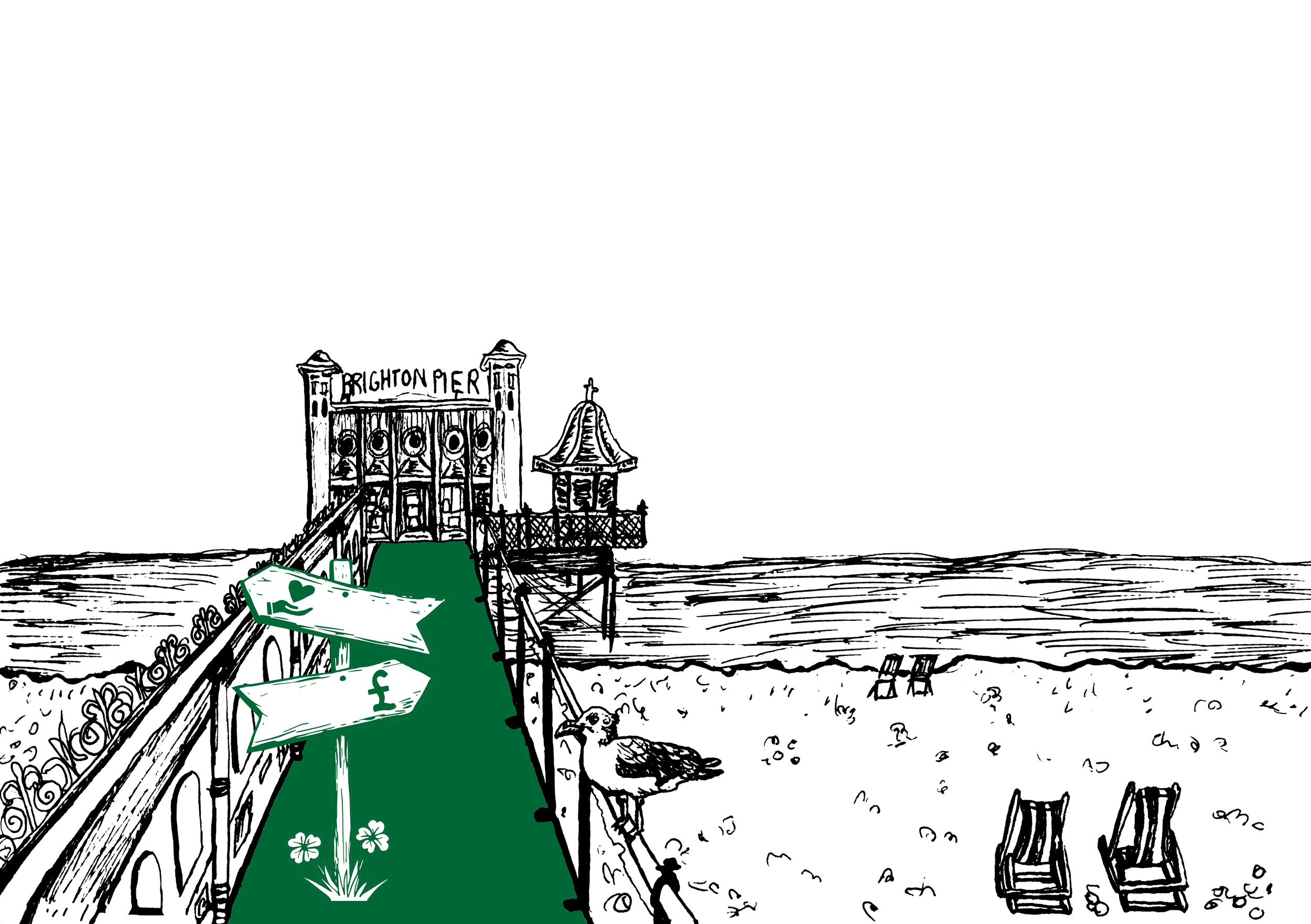 BRIGHTON: The DETERMIND signpost at Brighton Pier, watched keenly by a seagull. Underneath the pier is the beach, with deckchairs facing out to the sea.